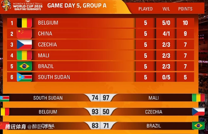 除此之外,捷克女篮、巴西女篮与马里女篮同为2胜3负,但捷克女篮与马里女篮均晋级女篮世界杯正赛,而巴西女篮与南苏丹女篮均是出局,尤其是南苏丹女篮0胜5负垫底。
