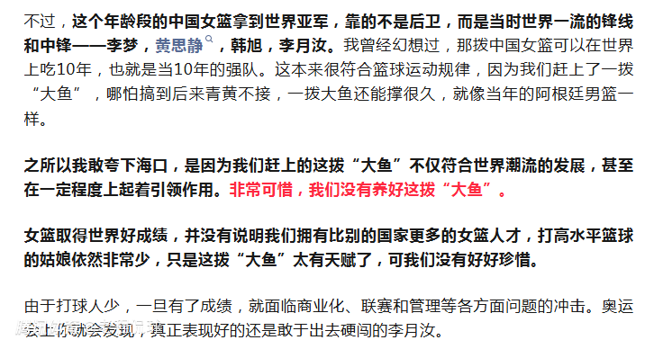 “女篮取得世界好成绩,并没有说明我们拥有比别的国家更多的女篮人才,打高水平篮球的姑娘依然非常少,只是这拨大鱼太有天赋了,可我们没有好好珍惜。”