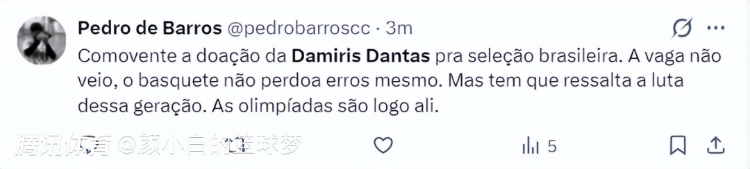 赛后有巴西球迷表示,丹特斯对巴西女篮的贡献令人感动,虽然她未能帮助巴西队拿到门票但她的努力会让下一代为之动容,奥运会就在那里。