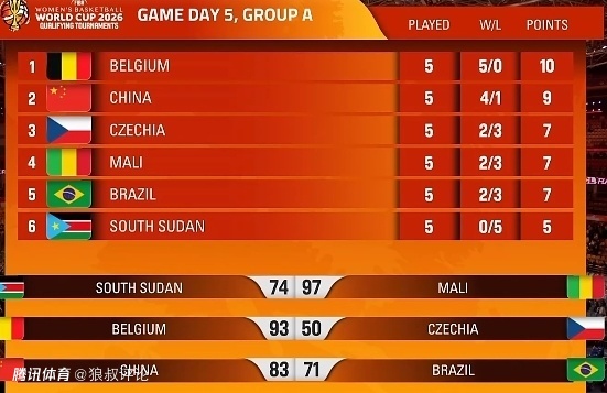 以欧洲冠军身份锁定世界杯正赛席位的比利时五战全胜获得A组头名,中国女篮排名第二。马里、捷克和巴西同为两胜三负,比较相互交手时的净胜分,马里和捷克成为本组另外两支晋级世界杯正赛的球队。