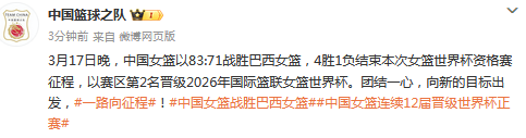 赛后,中国篮协官方第一时间发文:3月17日晚,中国女篮以83:71战胜巴西女篮,4胜1负结束本次女篮世界杯资格赛征程,以赛区第2名晋级2026年国际篮联女篮世界杯。团结一心,向新的目标出发。