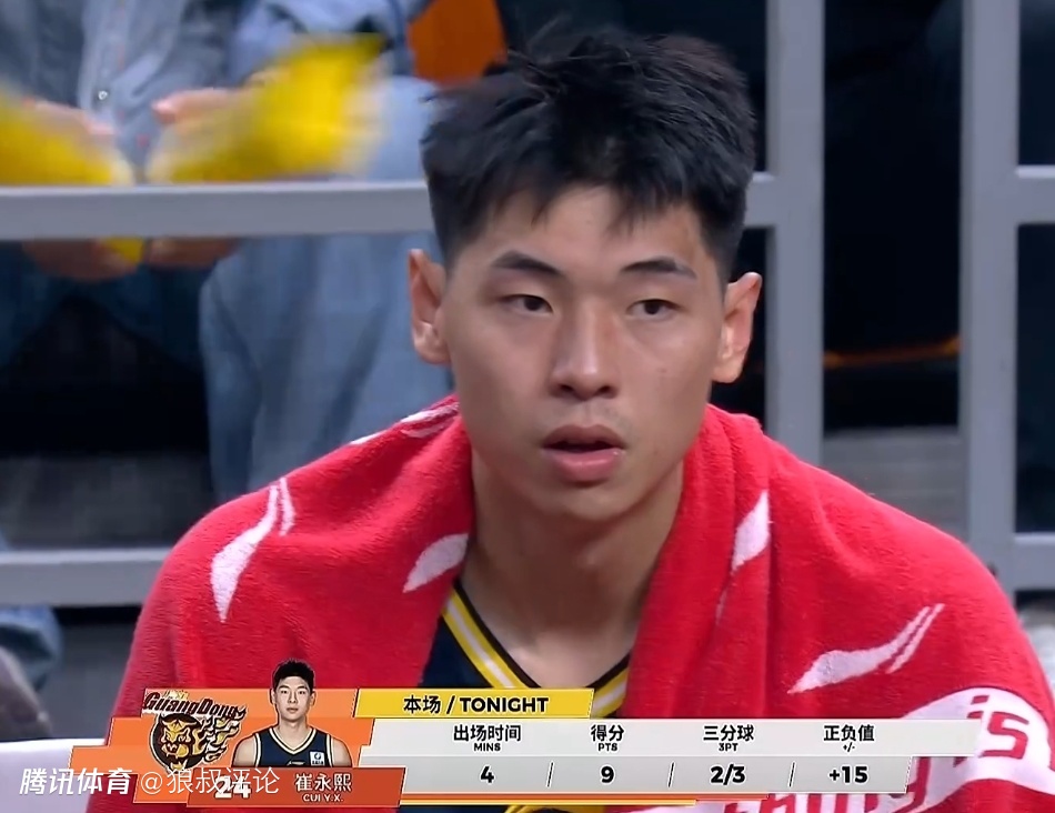 整体表现与上一场相比,比赛感觉有大幅度提升,特别是首节比赛,替补登场期间,解决了广东男篮最需要的外线投篮火力输出,防守端也能顶住新疆男篮锋线的冲击,就算是最终5次犯规离场,崔永熙在场的正负值达到了+30,位居广东男篮全队第一。