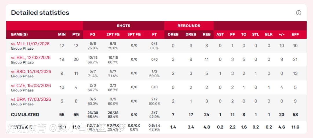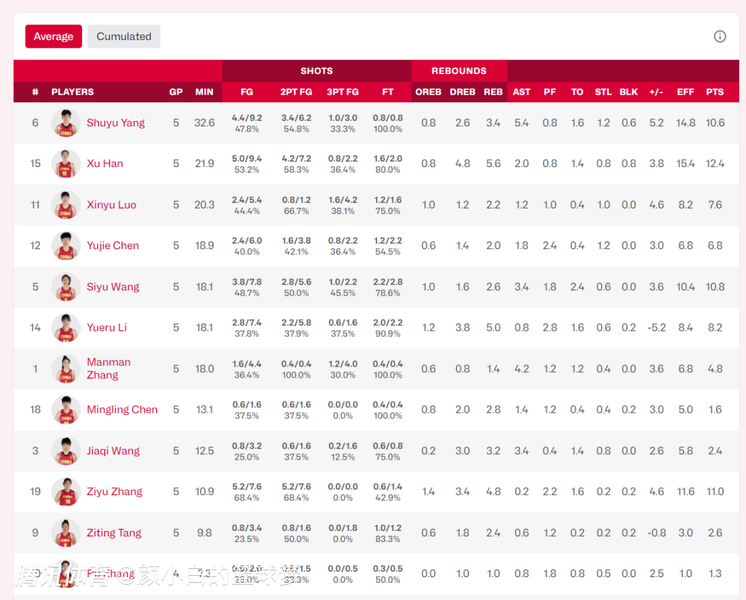张子宇场均10.9分钟全队倒数第三,但场均11分全队第二,命中率68.4%也是全队第一,场均4.8篮板全队第三,18岁的张子宇已经是这支球队的真正核心。