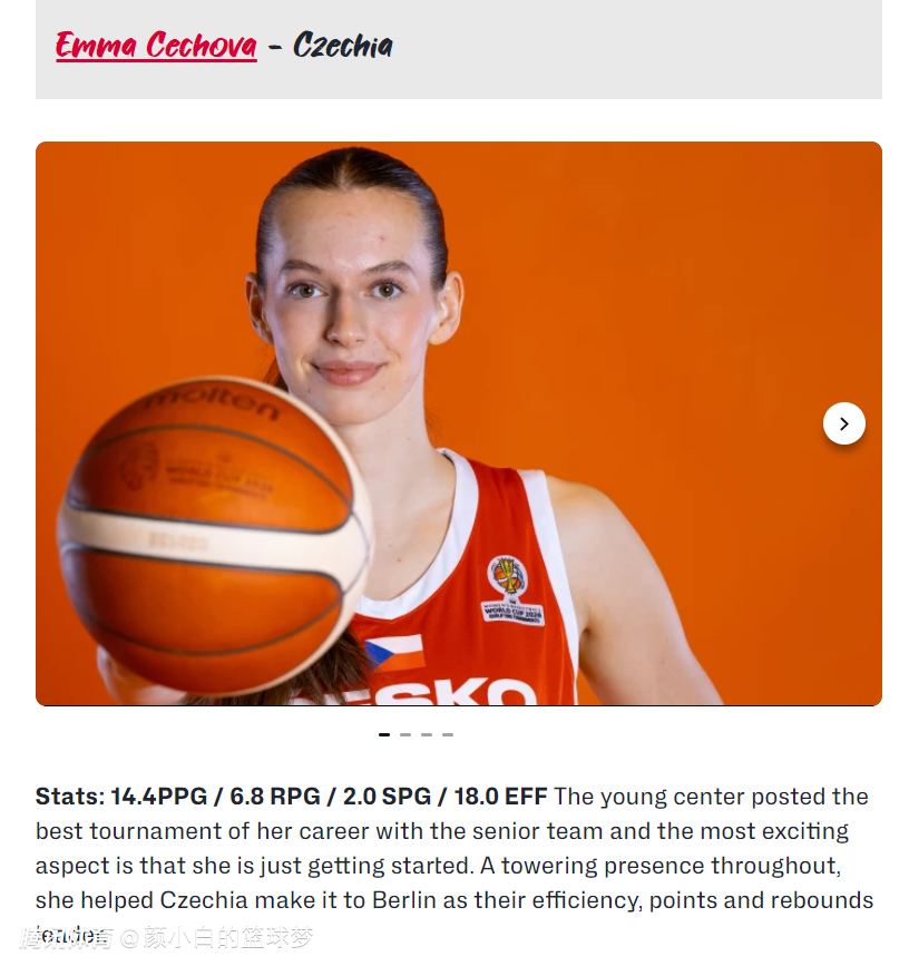 女篮世界杯16支正赛球队已经产生,武汉赛区的最佳阵容也出炉:阿莱曼德(比利时)、梅斯曼(比利时)、杨舒予(中国)、海拉达(马里)、切霍娃(捷克)。这套最佳阵容出炉后引发了一些争议,因为捷克队的中锋切霍娃效率远不及张子宇。