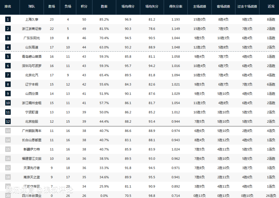 截止目前,上海男篮的战绩为23胜4负,位居积分榜第一。