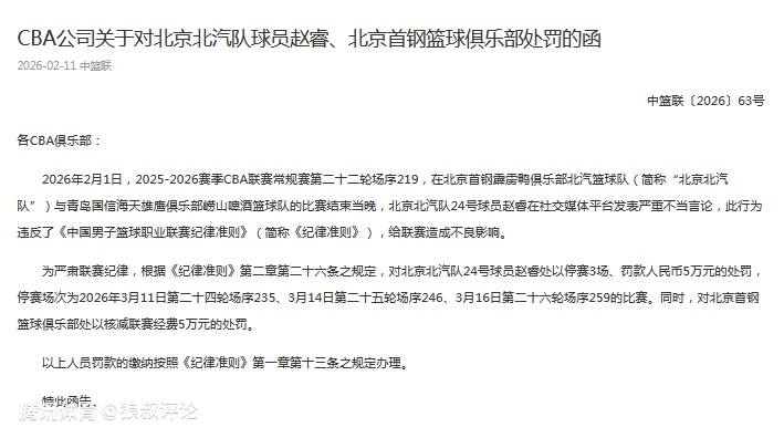 为严肃联赛纪律,根据《纪律准则》第二章第二十六条之规定,对北京北汽队24号球员赵睿处以停赛3场、罚款人民币5万元的处罚,停赛场次为2026年3月11日第二十四轮场序235、3月14日第二十五轮场序246、3月16日第二十六轮场序259的比赛。同时,对北京首钢篮球俱乐部处以核减联赛经费5万元的处罚。