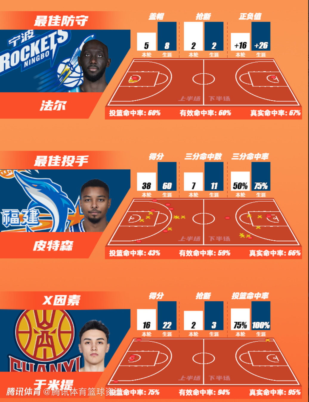 宁波富邦町渥男篮球员法尔以单场5次封盖的数据领跑盖帽榜;
