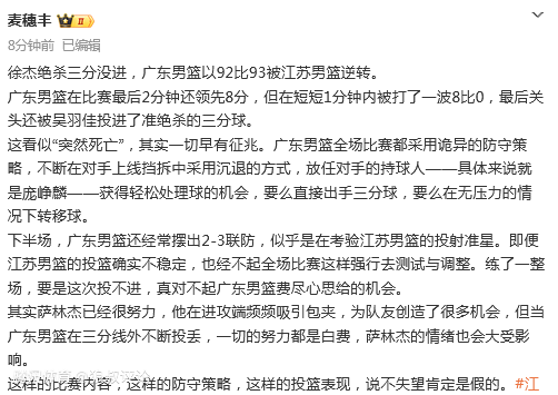 媒体人麦穗丰发文点评:广东男篮在比赛最后2分钟还领先8分,但在短短1分钟内被打了一波8比0,最后关头还被吴羽佳投进了准绝杀的三分球。