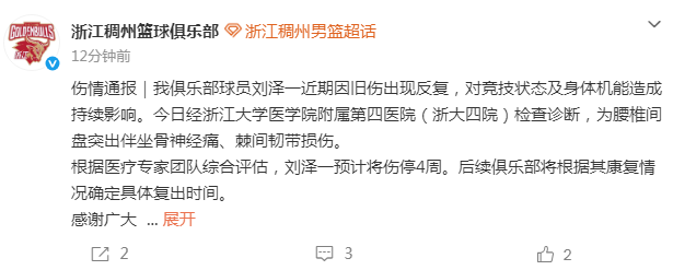如今浙江男篮官方通报刘泽一伤病情况:我俱乐部球员刘泽一近期因旧伤出现反复,对竞技状态及身体机能造成持续影响。今日经浙江大学医学院附属第四医院(浙大四院)检查诊断,为腰椎间盘突出伴坐骨神经痛、棘间韧带损伤。