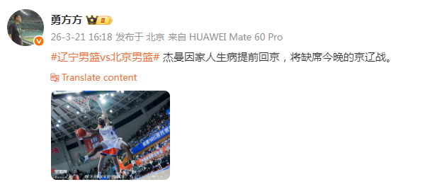 北京媒体人勇方方透露,北京男篮外援杰曼因家人生病提前回京,将无法出战今晚和辽宁队的比赛。
