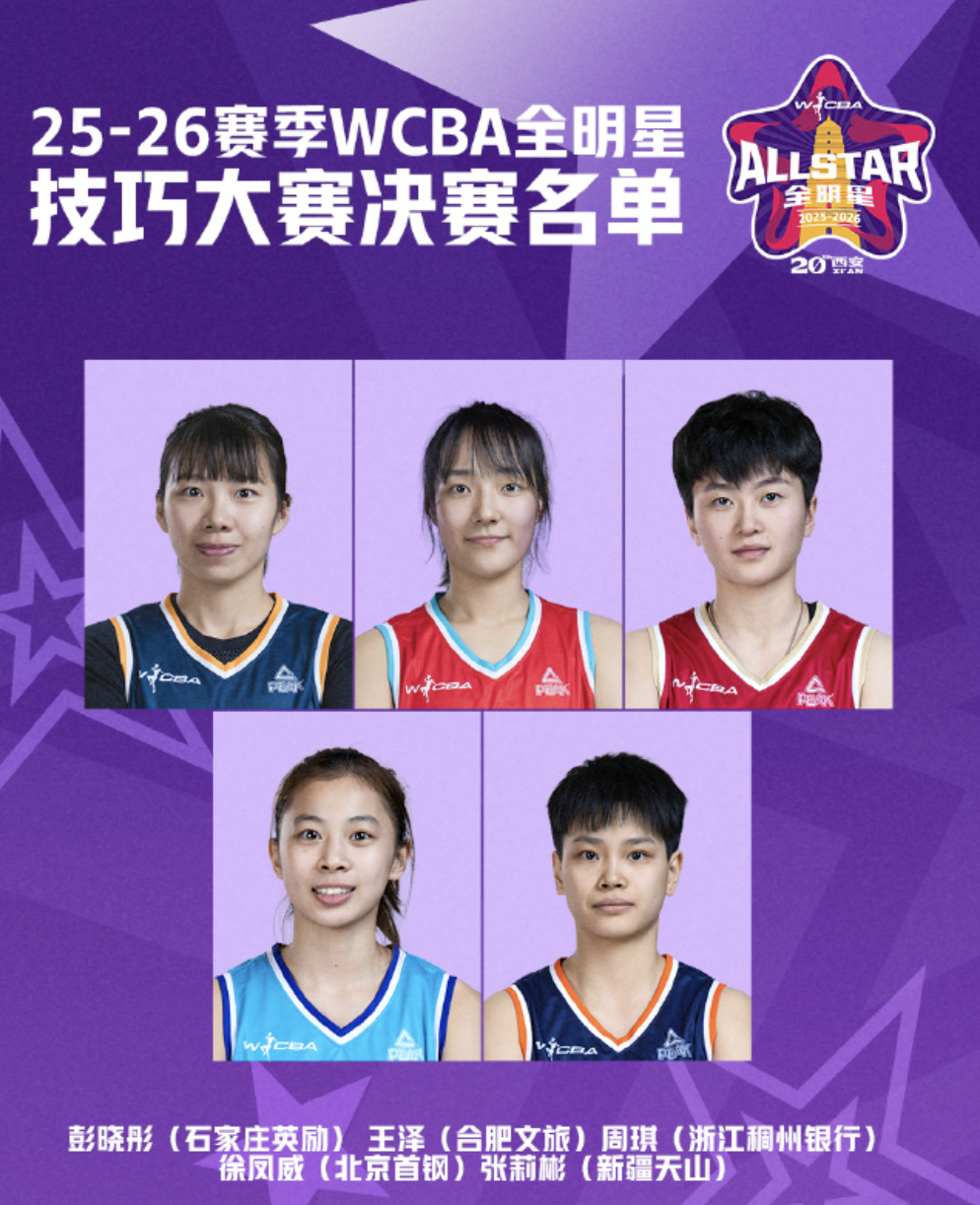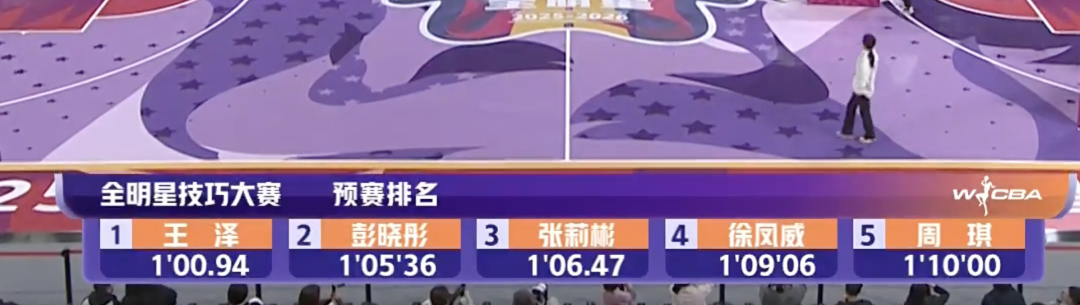 技巧挑战赛预赛方面,11名选手(含2名外卡)逐一挑战包含防守脚步、传球、运球、中投和三分投射在内的综合技术障碍。合肥文旅队王泽最后出场,3个三分球命中1球,以1分00秒94的成绩一举锁定第一。石家庄英励队彭晓彤速度出色,尽管3个三分球未能命中,仍凭1分05秒36拿到第二。新疆天山队张莉彬1分06秒47位列第三,北京首钢队徐凤威和浙江稠州银行队周琪分别以1分09秒06和1分10秒00进入前五。