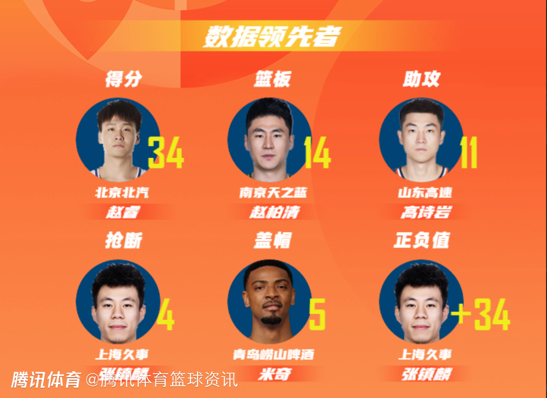 北京北汽球员赵睿以单场34分的数据领衔得分榜;