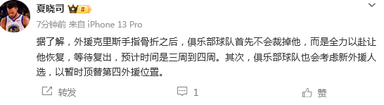 北京时间3月22日,根据媒体人“夏晓司”报道,外援克里斯手指骨折之后,俱乐部球队首先不会裁掉他,而是全力以赴让他恢复,等待复出,预计时间是三周到四周。其次,俱乐部球队也会考虑新外援人选,以暂时顶替第四外援位置。