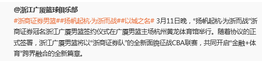 上个赛季完成夺冠之后,广厦男篮也获得了更多品牌的认可,新赛季除了第二阶段更换为“浙江浙商证券”外,同样获得了不同渠道的匹配赞助。