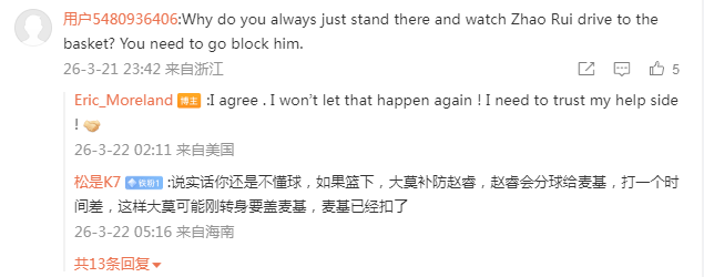 当有网友对莫兰德说:“你为什么总是站在那儿看着赵睿突破上篮?你得去盖他啊”后,莫兰德回复:“我同意你的看法。我不会再让那发生了。我需要相信我的弱侧协防能力。”