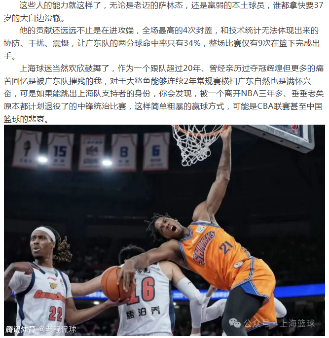 “如果能跳出上海队支持者的身份,你会发现,被一个离开NBA三年多、垂垂老矣原本都计划退役了的中锋统治比赛,这样简单粗暴的赢球方式,可能是CBA联赛甚至中国篮球的悲哀。”媒体人朱俊在公众号上写道。