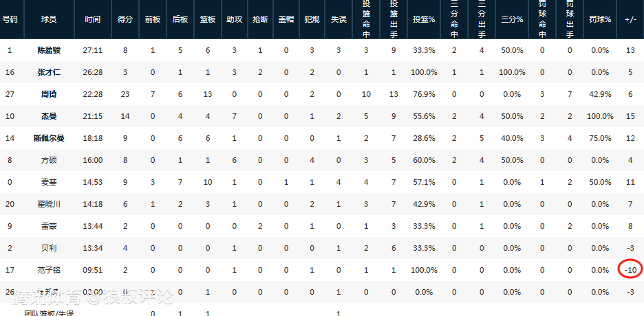 首先是以北京对阵天津的比赛为例子,虽然北京男篮顺利赢球,但范子铭出战接近10分钟,一次出手2分命中,但没有抢下一个篮板球,在场效率为-10,是北京男篮所有登场球员当中,唯一是负两位数的。