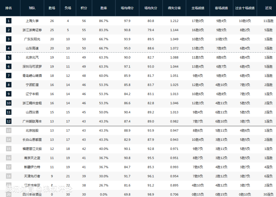 广州则是以13胜17负的战绩跌至第十二位,与北控,吉林相同的战绩,接下来想要争夺季后赛名额,每一场都是需要全力以赴的比赛。