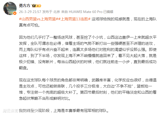 “我觉得至少现阶段,上海是本赛季最有冠军相的球队。”媒体人勇方方在社媒上写道。