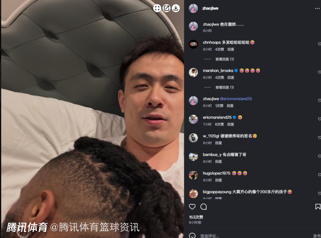 照片中,莫兰德躺在赵继伟身上,而赵继伟面对镜头则是一脸无奈。值得一提的是,莫兰德本尊也在评论区回复一个难过的表情包,另外前广东功勋外援马尚也评论了四个笑哭的表情包。
