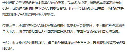 但是最新的情况有变,淡厚然改变计划,不打算参加CBA,并于今日启程返美,继续追求NCAA生涯和大学学位。