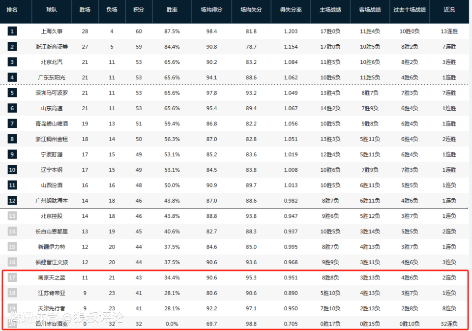 截止目前,CBA联赛后四名球队分别是南京同曦,江苏肯帝亚,天津先行者,四川丰谷酒业。
