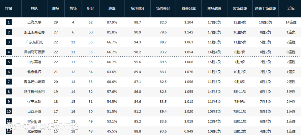 本场比赛过后,广厦的战绩为27胜6负,排在积分榜第2位。