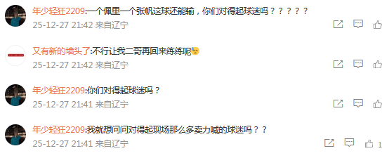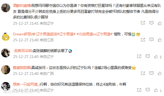 赛后,辽宁官方社媒遭到大量球迷留言,对于球队单一的战术体系表达不满。本场比赛也是辽宁队史第二次输给北控,此前北控对阵辽宁的战绩为1胜26负。