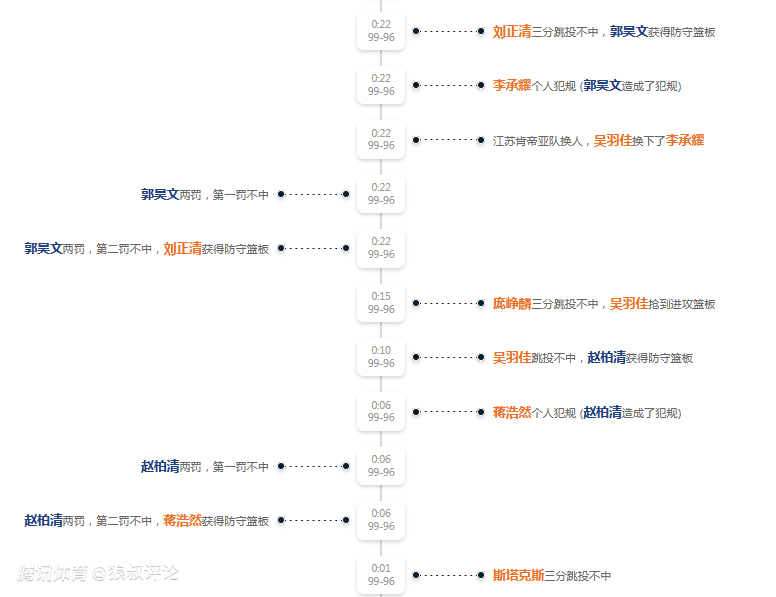 第四节最后22秒,同曦99-96江苏,刘正清强投三分不中,郭昊文获得篮板球,李承耀提前犯规,送郭昊文上罚球线,结果2罚不中。