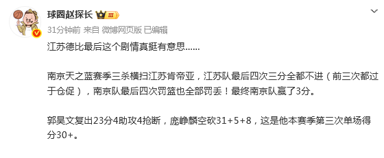 北京时间4月4日,CBA常规赛继续开打,南京同曦99-96击败江苏男篮。
