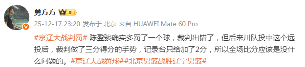 媒体人勇方方在社媒上表示,京辽大战引发争议的“北京队一回合6次罚球”,确实是裁判出错,导致北京队后卫陈盈骏多罚了一个球。但之后,北京队队长翟晓川的三分球只给了两分,所以,全场比分应该没问题。