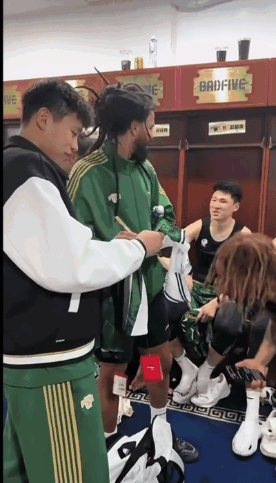 北京时间4月5日,昨晚结束的一场CBA常规赛,同曦男篮以99-96击败江苏男篮,赢得江苏德比,赛后同曦外援J.Cole在更衣室内给众队友签名、合影。