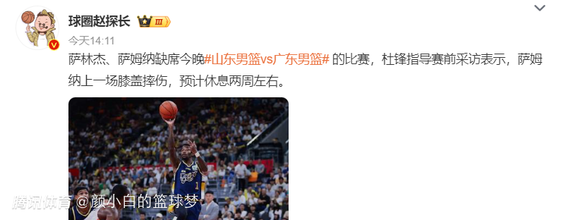 萨林杰、萨姆纳缺席这场比赛,杜锋指导赛前采访表示,萨姆纳上一场膝盖摔伤,预计休息两周左右。