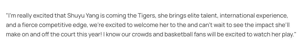 老虎队主教练凯莱布-斯克拉特分享了他的兴奋之情,并强调了杨舒予与球队体系的契合度:“杨舒予即将加盟老虎队,我真的非常兴奋。她带来了顶尖的天赋、国际大赛经验,以及极强的好胜心。我们非常欢迎她加入球队,已经迫不及待想看到她今年在赛场内外带来的影响了!我相信我们的球迷和篮球爱好者们都会很期待看她打球。”
