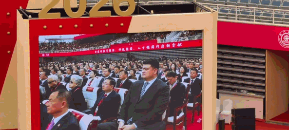 庆典现场,姚明身着黑色西装,落座第二排。值得一提的是,学校领导在发现姚明之后,还上前与姚明打招呼、开玩笑。