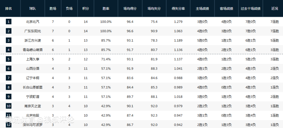 CBA常规赛第七轮继续开打,上演7场对决当中,广东和北京收获7连胜,竞争榜首的位置激烈,山西,新疆均遭到连败,宁波,吉林均胜率超过了50%,四川男篮则是成为目前唯一0胜的球队。
