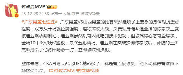 对于比赛,该媒体人表示:“整体来看,CBA晋粤大战比UFC(终极格斗冠军赛)精彩多了,就是有点废球员,动不动就得有球员下场接受治疗。”