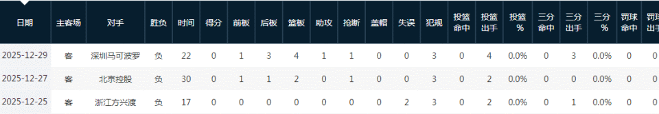 对阵深圳22分钟0分3篮板1助攻1抢断3犯规