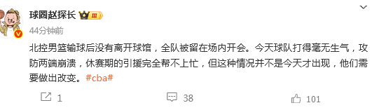 赛后,根据媒体人赵探长的报道,北控男篮输球后没有离开球馆,全队被留在场内开会。今天球队打得毫无生气,攻防两端崩溃,休赛期的引援完全帮不上忙,但这种情况并不是今天才出现,他们需要做出改变。