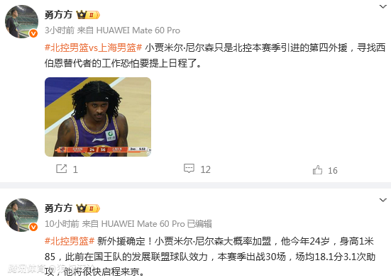 有消息称,北控男篮引进了小贾米尔·尼尔森,今年24岁,身高1米85,此前在国王队的发展联盟球队效力,本赛季出战30场,场均18.1分3.1次助攻,他将很快启程来京。