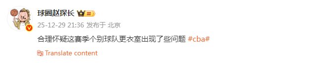 媒体人赵探长29日晚在社媒上表示,他怀疑有个别CBA球队本赛季更衣室出现问题。而且,他称自己是合理的怀疑。