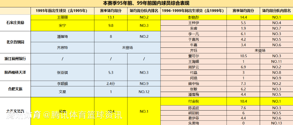 从竞技表现来看,这两批球员仍是各队不可或缺的中坚力量,多支球队的得分核心均来自这两个年龄段。山东队的95前球员杨衡瑜和曹君伟场均15.8分和15.4分,牢牢占据山东队国内球员得分榜前两名;新疆队拥有6名出生于95年前的球员,该群体不仅人数占优,得分表现更是包揽新疆队国内球员得分榜前三。此外,石家庄、大连、河南、江西等球队的国内球员得分榜中,这两批球员也均占据前三或前二的席位,其在关键时刻的经验优势、战术执行力,成为球队取得比赛胜利的重要保障。
