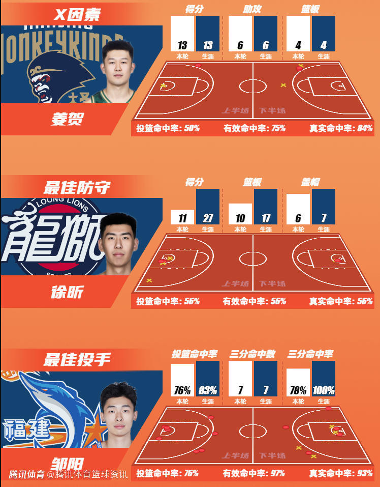 山东男篮球员克里斯以单场36分的数据领衔得分榜; 山西男篮球员刘传兴以单场17个篮板的数据领衔篮板榜; 深圳男篮球员约翰逊以单场12次助攻领跑助攻榜; 浙江男篮球员兰道夫以单场4次抢断的数据领衔抢断榜; 广州男篮球员徐昕以单场6次封盖的数据领跑盖帽榜; 浙江广厦球员赵岩昊以+36的正负值领先。