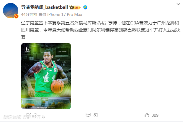 如今根据媒体人导演我躺哪_basketball报道:“辽宁男篮签下本赛季第五名外援马库斯-乔治-亨特,他在CBA曾效力过广州男篮和四川男篮,今年夏天他帮助西亚豪门阿尔利雅得拿到黎巴嫩联赛冠军,并打入亚冠决赛。”