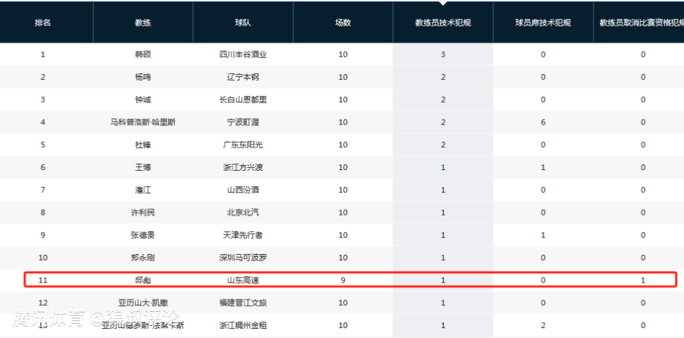 而在取消比赛资格犯规方面,邱彪成为唯一被驱逐的主帅,引发球迷和媒体的热议。