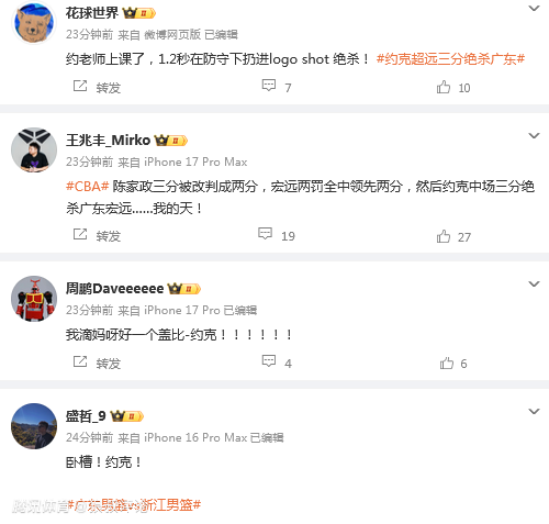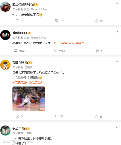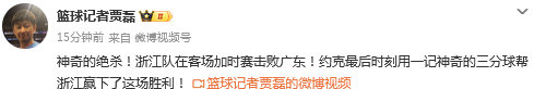 篮球记者“贾磊”发文点评:“神奇的绝杀!浙江队在客场加时赛击败广东!约克最后时刻用一记神奇的三分球帮浙江赢下了这场胜利”