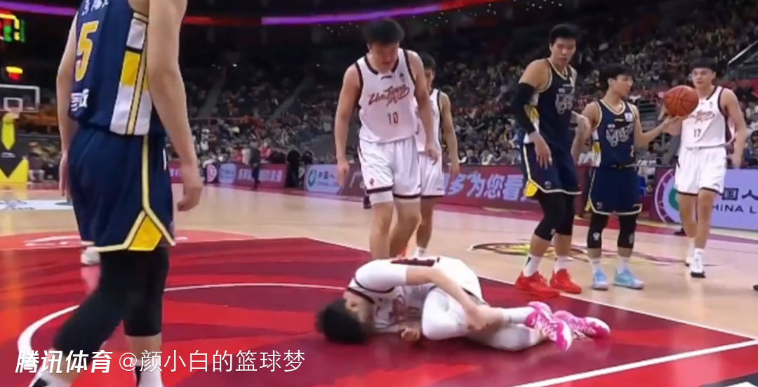 张洪硕扣篮被拉下来,落地左脚先落地又一个反关节扭曲,随后他跳着下场。