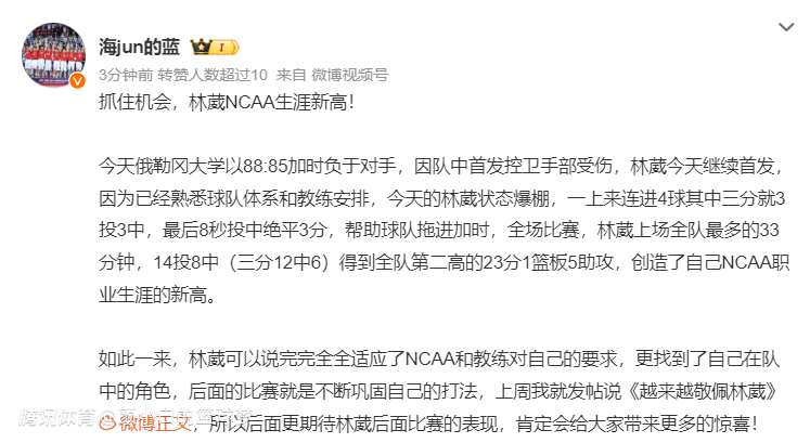 国内媒体:林葳可以说完全适应了NCAA教练对他的要求,更找到了自己在队内的角色,后面的比赛就是不断巩固自己的表现,肯定会继续给大家带来惊喜的。