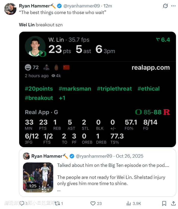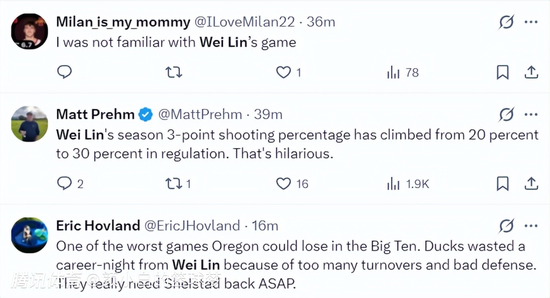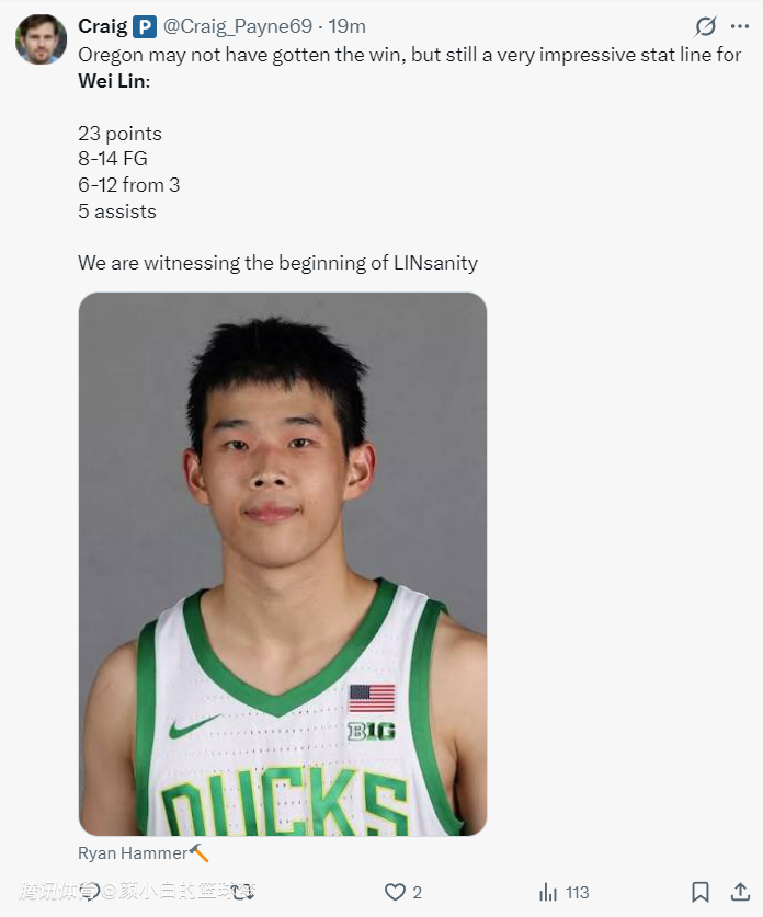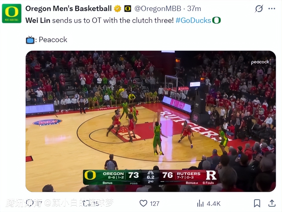 俄勒冈大学在赛后也晒出了林葳绝平的三分点赞,这个球林葳已经完全失去了节奏,他虚晃后直接干拔三分命中,他帮助球队拖入了加时赛,只可惜加时赛队友们接连的拉胯,最终俄勒冈惜败,林葳真的尽力了。