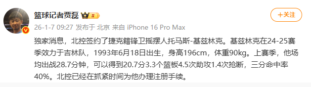 北京时间1月7日,据篮球记者贾磊透露,北控男篮已签约捷克籍锋卫摇摆人托马斯-基兹林克。